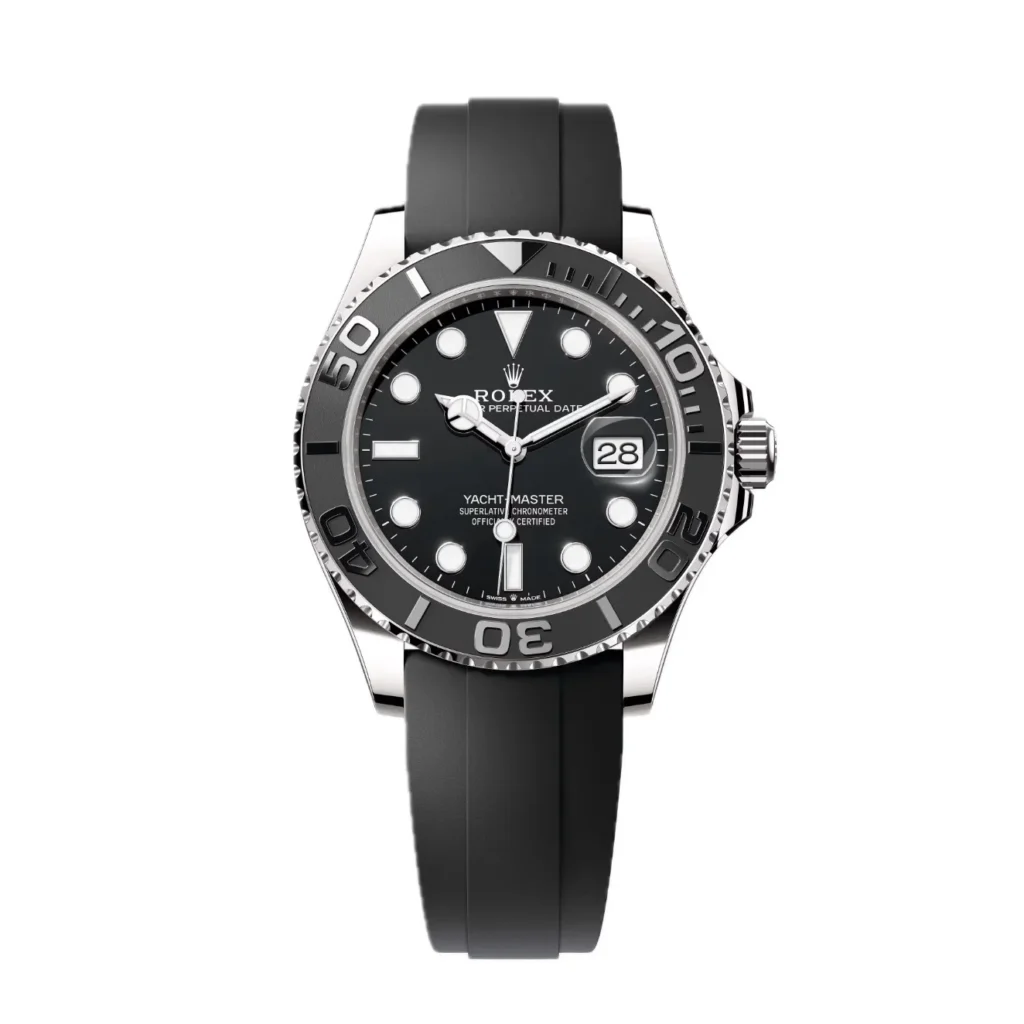 The current reference 226659 (steel with white rubber Oyster bracelet) and 226681 (Rolesor with rubber bracelet) represent the accessible end of the Yacht-Master II range. The reference 226659 in particular — all steel with the white dial option — has attracted the replica market's attention because its strong design identity doesn't depend on precious metal for its impact.