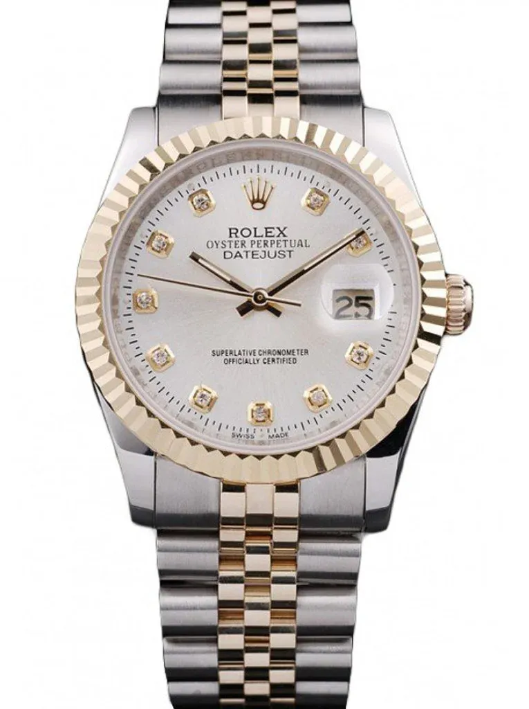 If you were to build the Platonic ideal of a Datejust super clone, it would look something like this. The 36mm case is the original Datejust format — the size Wilsdorf himself wore — and in 2026 it sits perfectly on a medium male wrist or a larger female wrist. The white lacquer dial catches light with a gloss that is indistinguishable from genuine article at normal distances.