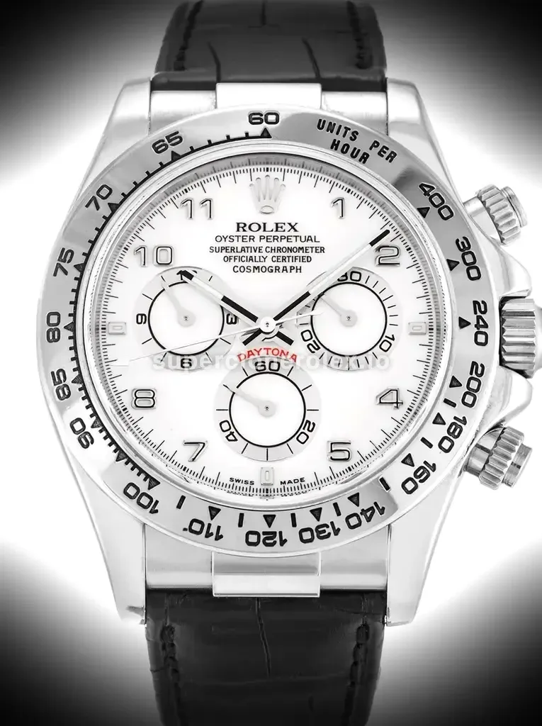 The Rolex Daytona 40mm White Dial 116519 brings the iconic Daytona design to your wrist. Featuring a white dial in a 40mm 904l steel case, this super clone captures every detail of the genuine reference.