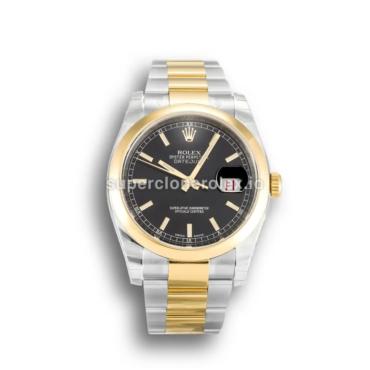 The Rolex Datejust 116203 36mm Black Dial Two-Tone Watch features a Black dial on a Oyster bracelet, powered by a precise automatic movement. Crafted in Stainless Steel & Yellow Gold Plated with Sapphire crystal and 30m (Swiss), this Datejust reference delivers authentic Rolex aesthetics. Available in 36 mm, this elegant ladies timepiece offers premium quality super clone craftsmanship at an accessible price point.