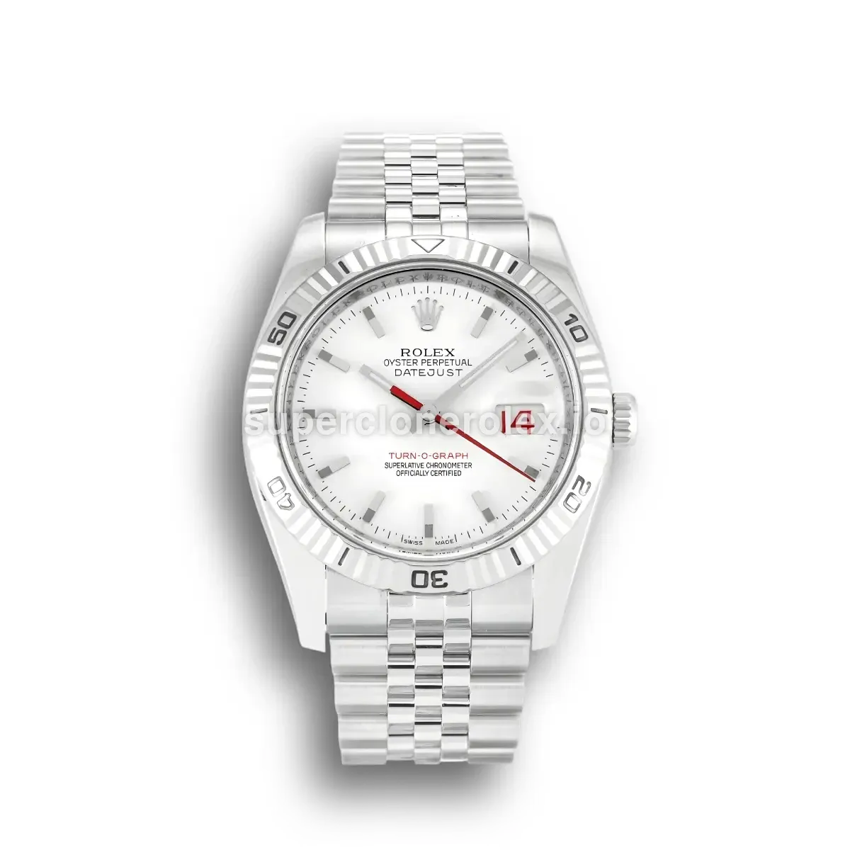 The Rolex Datejust Turn-O-Graph 116264 Stainless Steel 36mm White Dial features a White dial on a Jubilee bracelet, powered by a precise automatic movement. Crafted in Stainless Steel & White Gold Plated with Sapphire crystal and 30m (Swiss), this Datejust reference delivers authentic Rolex aesthetics. Available in 36 mm, this elegant ladies timepiece offers premium quality super clone craftsmanship at an accessible price point.