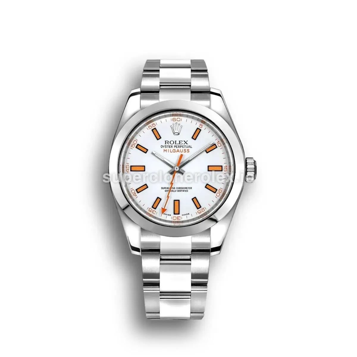 The Rolex Milgauss 40mm White Dial 116400 Steel Watch features a White dial on a Oyster bracelet, powered by a precise automatic movement. Crafted in Stainless Steel with Sapphire crystal and 30m (Swiss), this Milgauss reference delivers authentic Rolex aesthetics. Available in 40 mm, this precision timepiece offers premium quality super clone craftsmanship at an accessible price point.