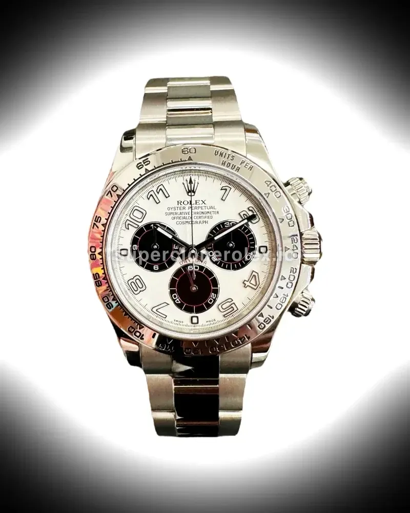 The Rolex Cosmograph Daytona 116509 Panda Dial Arabic features a Silver dial on a Oyster bracelet, powered by a precise automatic chronograph movement. Built for motorsport precision with Sapphire crystal and 30m (Swiss) water resistance, this legendary Daytona chronograph delivers authentic Rolex racing aesthetics. Available in 40 mm, this precision timepiece offers premium quality super clone craftsmanship at an accessible price point.