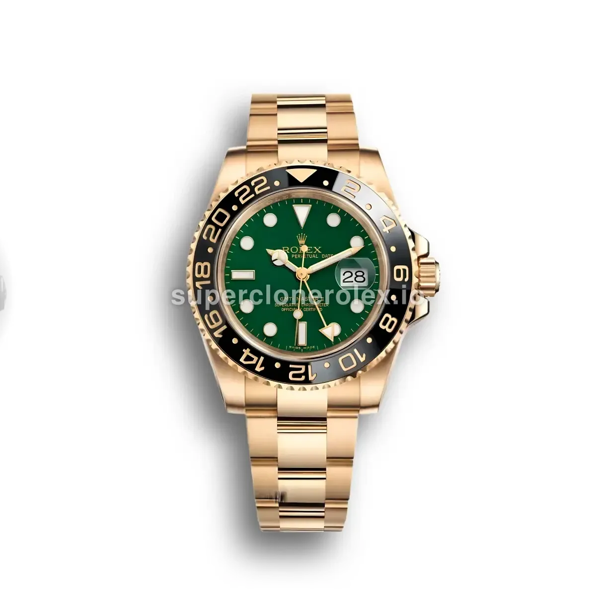 The Rolex GMT-Master II 116718GSO - 40mm Green Dial Anniversary Edition features a Green dial on a Oyster bracelet, powered by a precise automatic GMT movement. Engineered for world travelers with Sapphire crystal and dual-timezone tracking, this GMT-Master reference delivers authentic Rolex GMT aesthetics. Available in 40 mm, this precision timepiece offers premium quality super clone craftsmanship at an accessible price point.