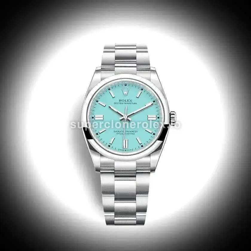 The Oyster Perpetual 36mm Turquoise Blue Dial 126000 features a Turquoise dial on a Oyster bracelet, powered by a precise automatic movement. Crafted in Stainless Steel with Sapphire crystal and 30m (Swiss), this Oyster Perpetual reference delivers authentic Rolex aesthetics. Available in 36 mm, this elegant ladies timepiece offers premium quality super clone craftsmanship at an accessible price point.