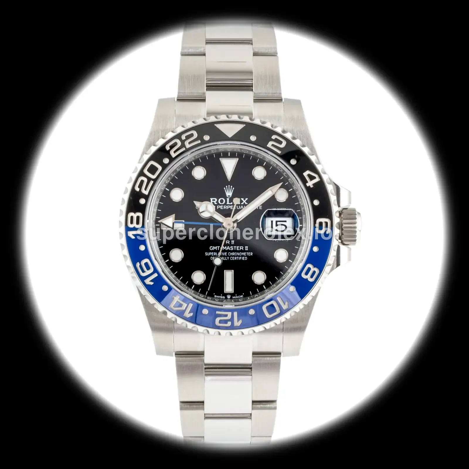 The Rolex GMT-Master II 126710BLNR Batman Black-Blue Bezel 41mm features a Black dial on a Oyster bracelet, powered by a precise automatic GMT movement. Engineered for world travelers with Sapphire crystal and dual-timezone tracking, this GMT-Master reference delivers authentic Rolex GMT aesthetics. Available in 40 mm, this precision timepiece offers premium quality super clone craftsmanship at an accessible price point.