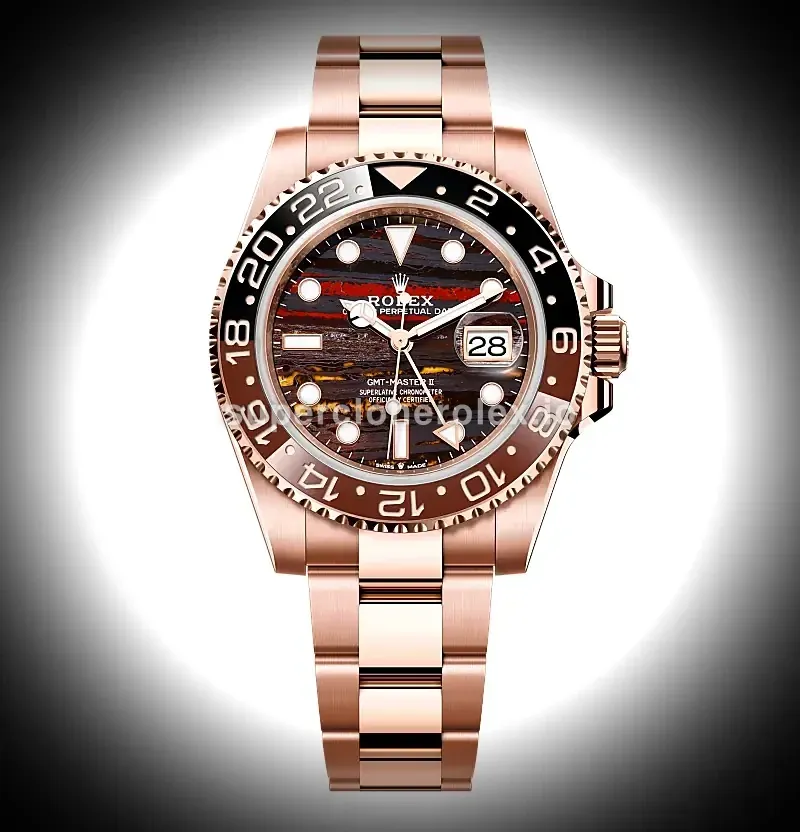 Brand Rolex Model GMT-Master II Reference 126715CHNR Movement Kinetic (Automatic) Case Diameter 40 mm Case Material 18k Everose gold Band Material 18k everose gold (Oyster) Dial Color Tiger iron Quality Swiss (ETA) Glass Sapphire crystal Water Resistance Waterproof up to 30 meters. Super Clone Quality Control Video https://youtu.be/dyYx39ctytw