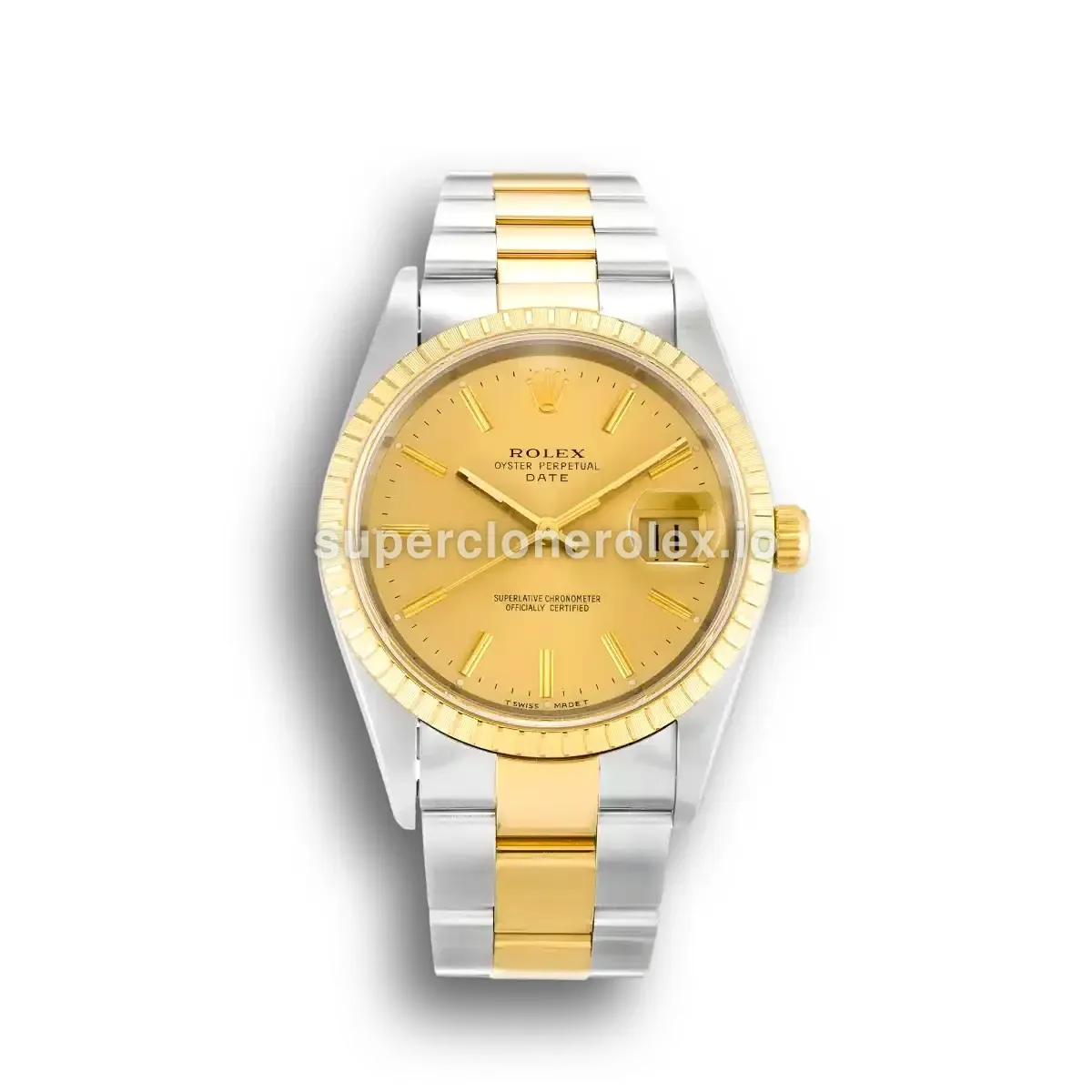 The Rolex Oyster Perpetual 34mm Champagne Dial 15223 features a Champagne dial on a Oyster bracelet, powered by a precise automatic movement. Crafted in Stainless Steel & Yellow Gold Plated with Sapphire crystal and 30m (Swiss), this Oyster Perpetual reference delivers authentic Rolex aesthetics. Available in 34 mm, this elegant ladies timepiece offers premium quality super clone craftsmanship at an accessible price point.