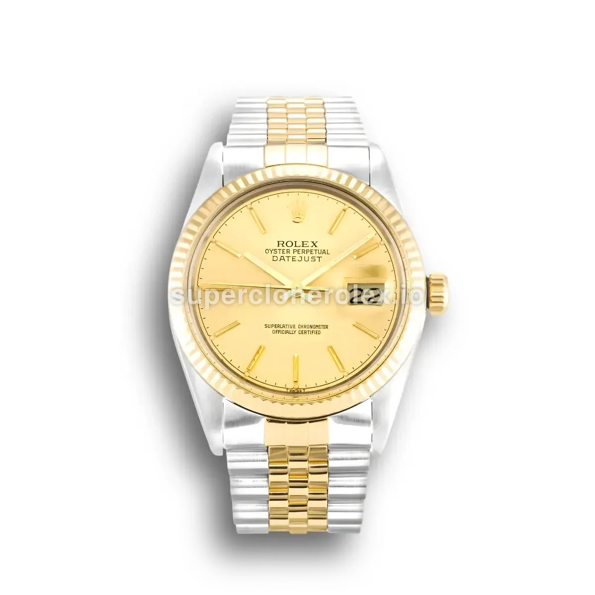 The Rolex Datejust 16013 - 36mm Champagne Dial Two-Tone features a Champagne dial on a Jubilee bracelet, powered by a precise automatic movement. Crafted in Stainless Steel & Yellow Gold Plated with Sapphire crystal and 30m (Swiss), this Datejust reference delivers authentic Rolex aesthetics. Available in 36 mm, this elegant ladies timepiece offers premium quality super clone craftsmanship at an accessible price point.