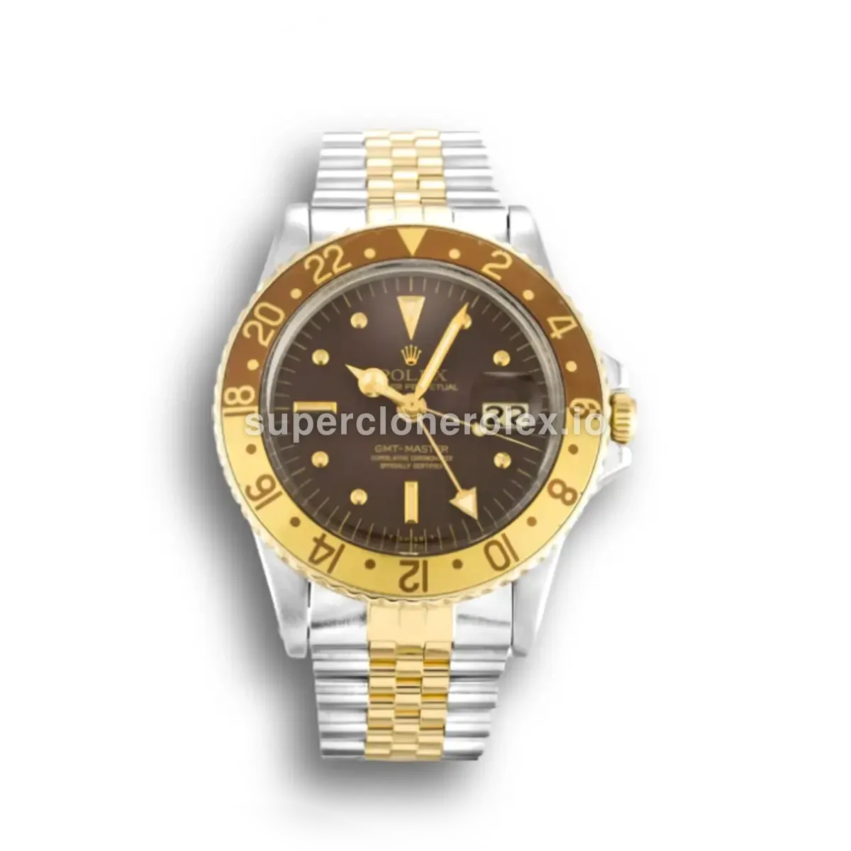 The Rolex GMT-Master 1675 - 40mm Copper Dial Vintage Tropical features a Copper dial on a Jubilee bracelet, powered by a precise automatic GMT movement. Engineered for world travelers with Sapphire crystal and dual-timezone tracking, this GMT-Master reference delivers authentic Rolex GMT aesthetics. Available in 40 mm, this precision timepiece offers premium quality super clone craftsmanship at an accessible price point.