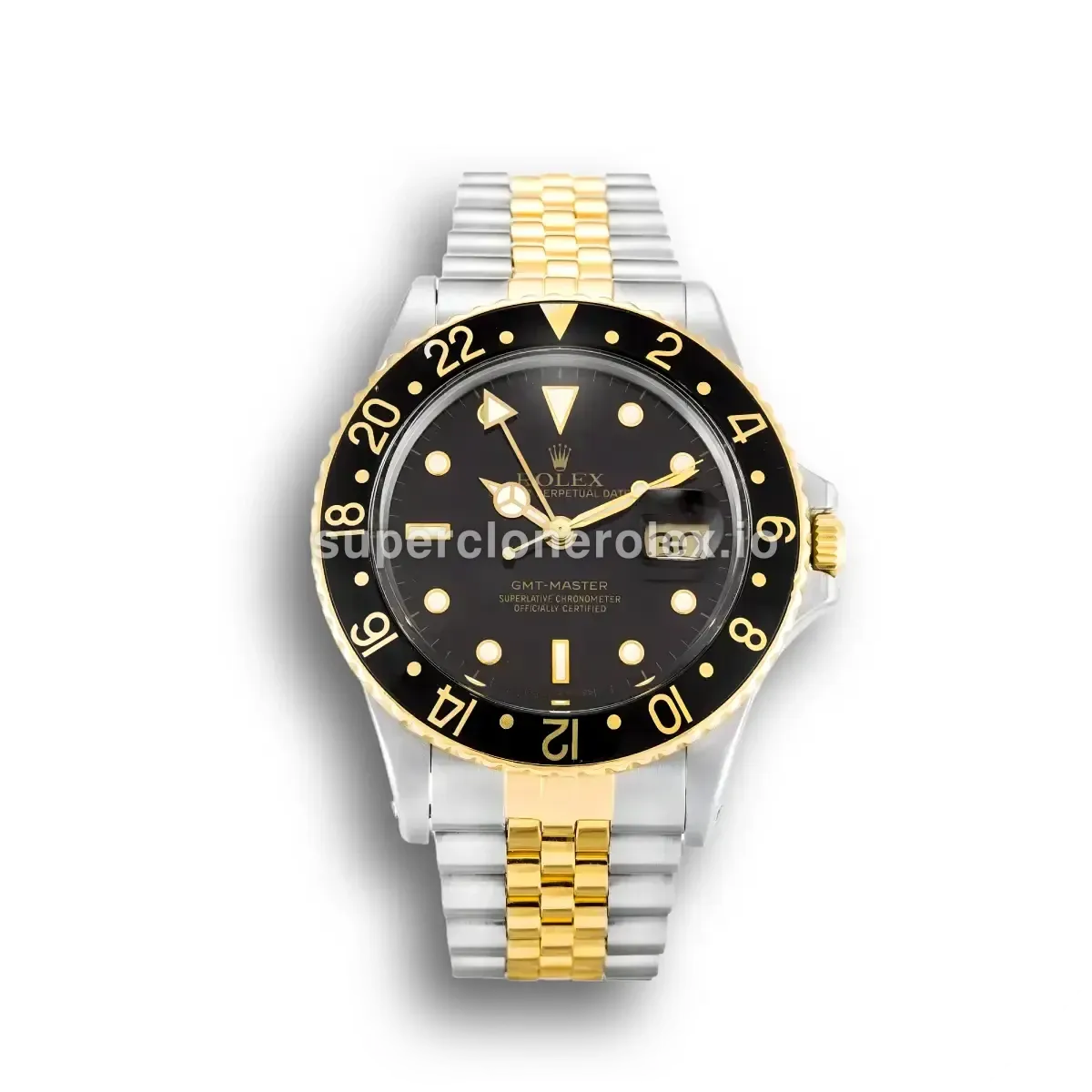 The Rolex GMT-Master 16753 - 38mm Black Dial Two-Tone Nipple Dial features a Black dial on a Jubilee bracelet, powered by a precise automatic GMT movement. Engineered for world travelers with Sapphire crystal and dual-timezone tracking, this GMT-Master reference delivers authentic Rolex GMT aesthetics. Available in 38 mm, this precision timepiece offers premium quality super clone craftsmanship at an accessible price point.
