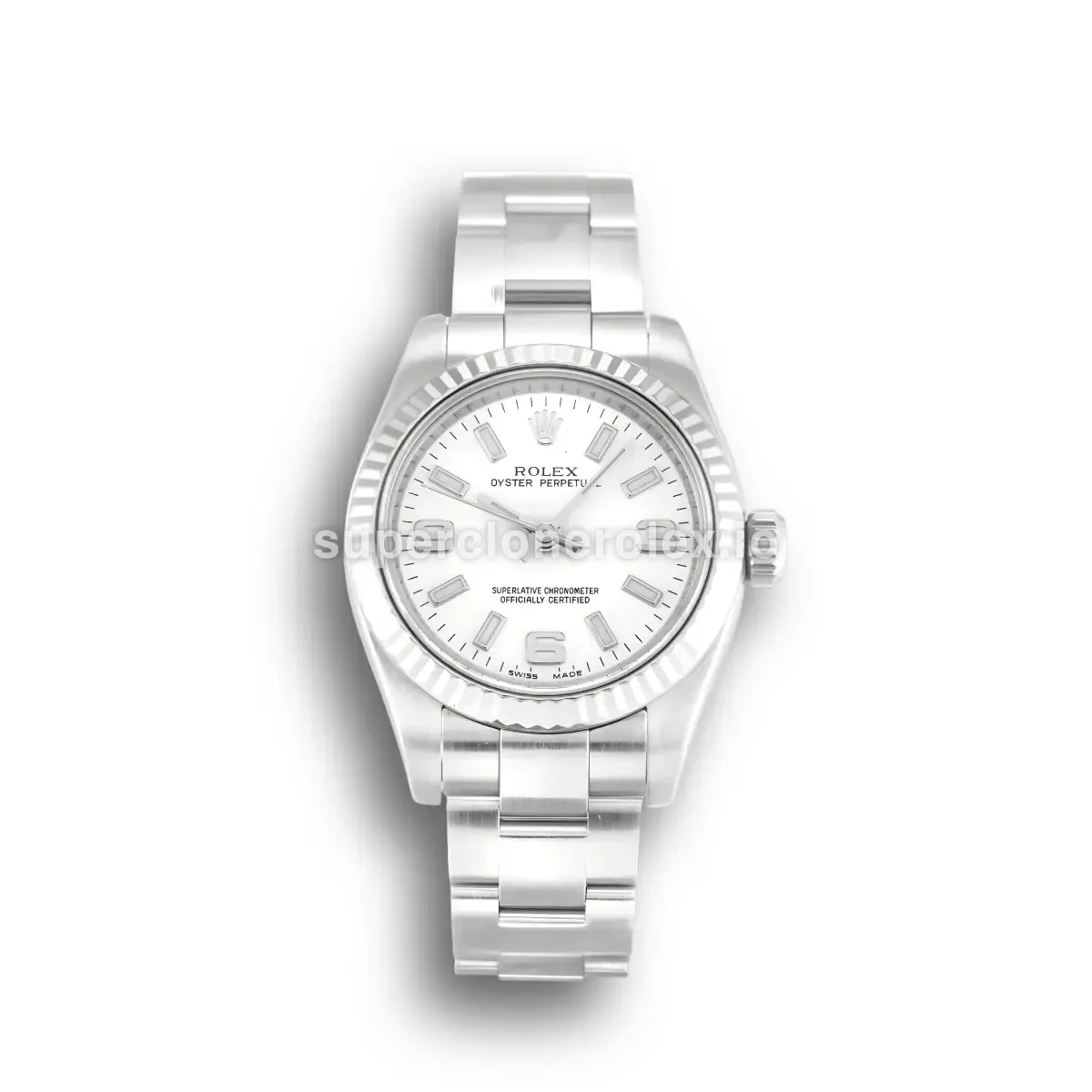 The Rolex Oyster Perpetual Lady 26mm White Dial 176234 features a White dial on a Oyster bracelet, powered by a precise automatic movement. Crafted in Stainless Steel & White Gold Plated with Sapphire crystal and 30m (Swiss), this Oyster Perpetual reference delivers authentic Rolex aesthetics. Available in 26 mm, this elegant ladies timepiece offers premium quality super clone craftsmanship at an accessible price point.
