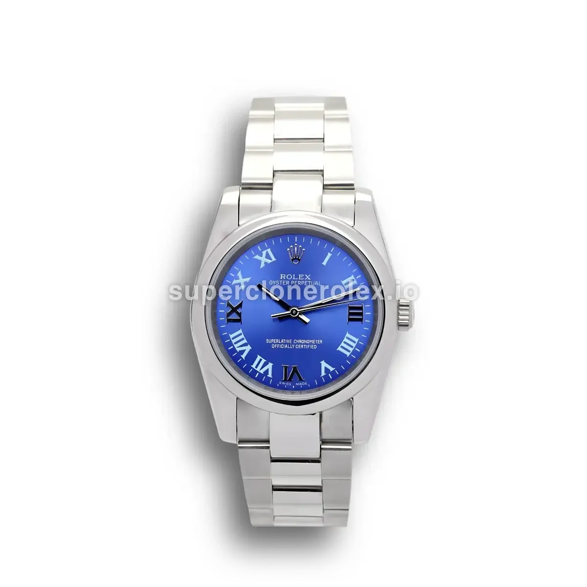 The Rolex Oyster Perpetual Lady 31mm Blue Dial 177200 features a Blue dial on a Oyster bracelet, powered by a precise automatic movement. Crafted in Stainless Steel with Sapphire crystal and 30m (Swiss), this Oyster Perpetual reference delivers authentic Rolex aesthetics. Available in 31 mm, this elegant ladies timepiece offers premium quality super clone craftsmanship at an accessible price point.