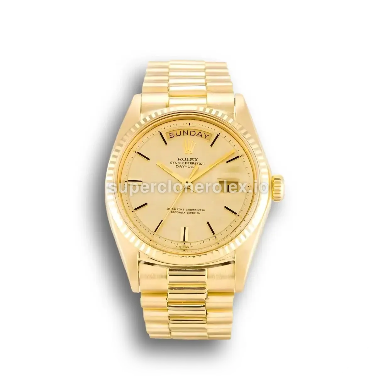 The Rolex Day-Date 1803 36mm Champagne Dial Watch features a Champagne dial on a President bracelet, powered by a precise automatic movement. Crafted in Yellow Gold Plated with Sapphire crystal and 30m (Swiss), this prestigious Day-Date reference delivers the authentic Rolex Presidents watch experience. Available in 36 mm, this elegant ladies timepiece offers premium quality super clone craftsmanship at an accessible price point.