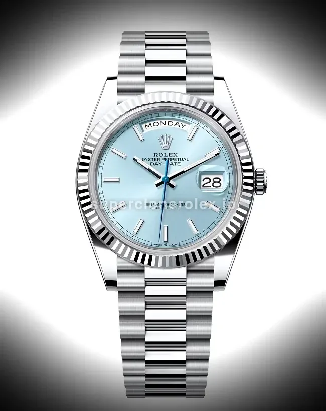 The Rolex Day-Date 40mm Ice Blue Dial 228236 features a Ice Blue dial on a President bracelet, powered by a precise automatic movement. Crafted in Platinum Plated with Sapphire crystal and 30m (Swiss), this prestigious Day-Date reference delivers the authentic Rolex Presidents watch experience. Available in 40 mm, this precision timepiece offers premium quality super clone craftsmanship at an accessible price point.