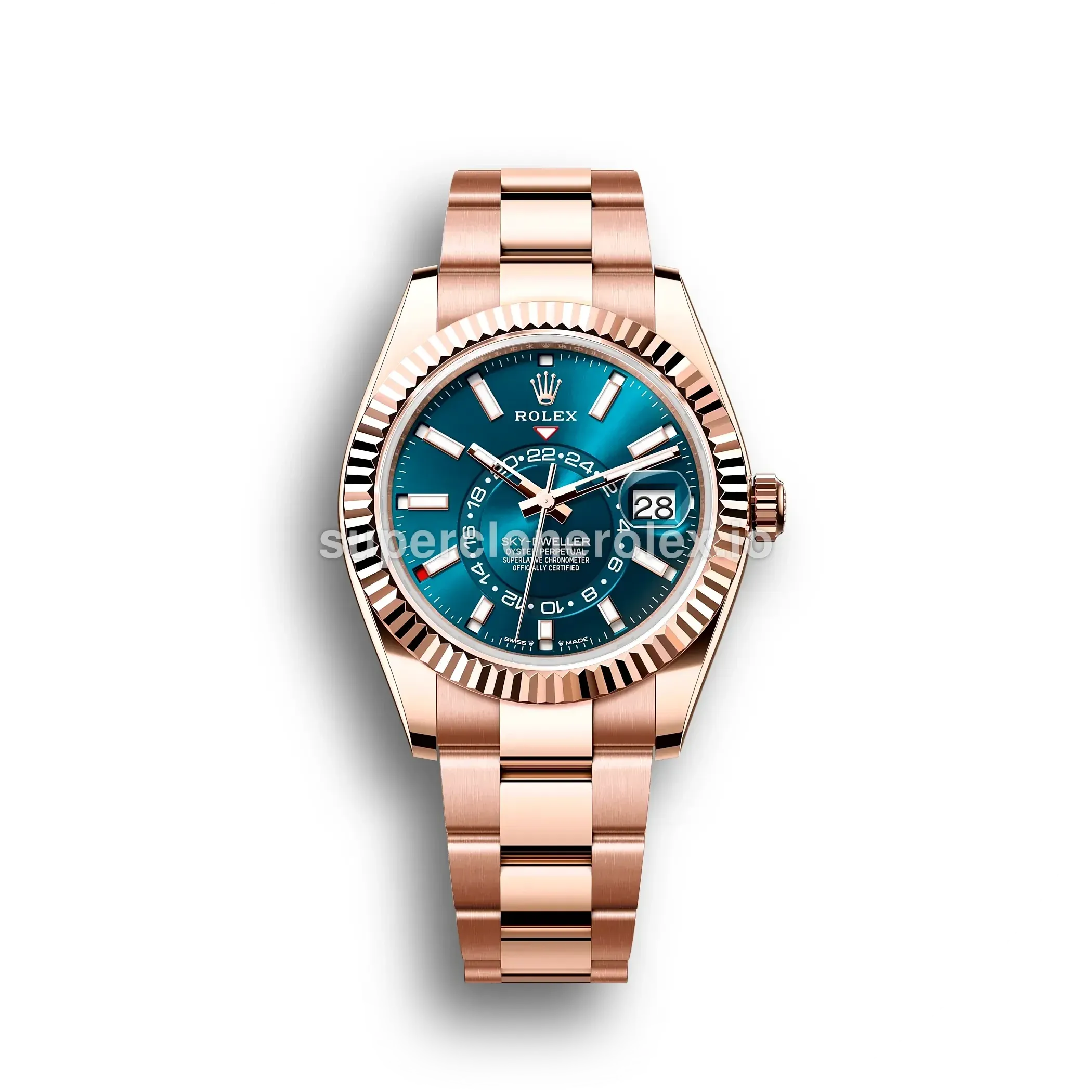 The Rolex Sky-Dweller 326935 Blue-Green Dial 42mm features a Blue-Green dial on a Oyster bracelet, powered by a precise automatic annual calendar movement. Engineered with annual calendar and GMT complication, crafted in Rose Gold Plated with Sapphire crystal, this sophisticated Sky-Dweller reference delivers authentic Rolex complexity. Available in 42 mm, this precision timepiece offers premium quality super clone craftsmanship at an accessible price point.