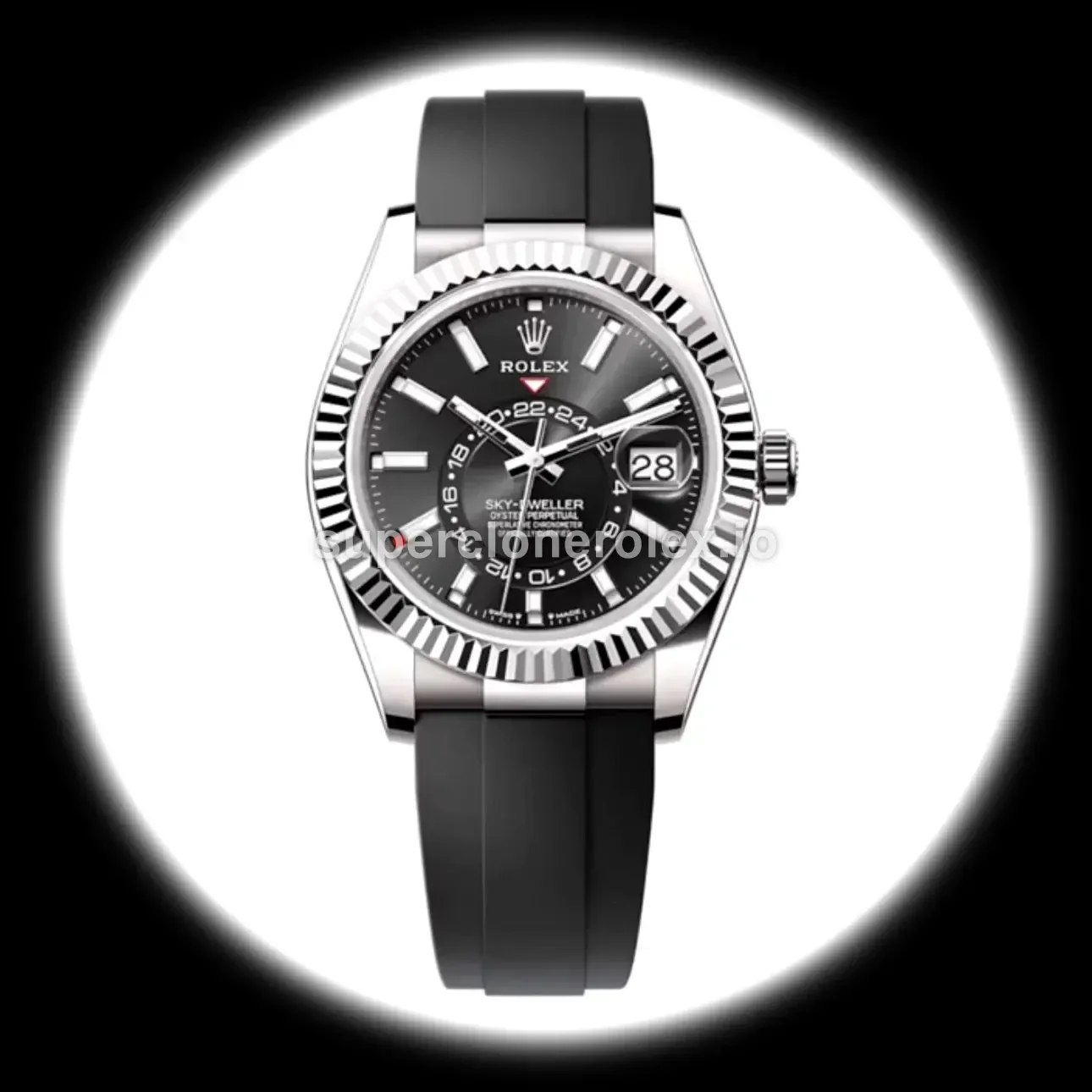 The Rolex Sky-Dweller 42mm Bright Black Dial Ref. 336239 features a Bright Black dial on a Oysterflex bracelet, powered by a precise automatic annual calendar movement. Engineered with annual calendar and GMT complication, crafted in White Gold Plated with Sapphire crystal, this sophisticated Sky-Dweller reference delivers authentic Rolex complexity. Available in 42 mm, this precision timepiece offers premium quality super clone craftsmanship at an accessible price point.