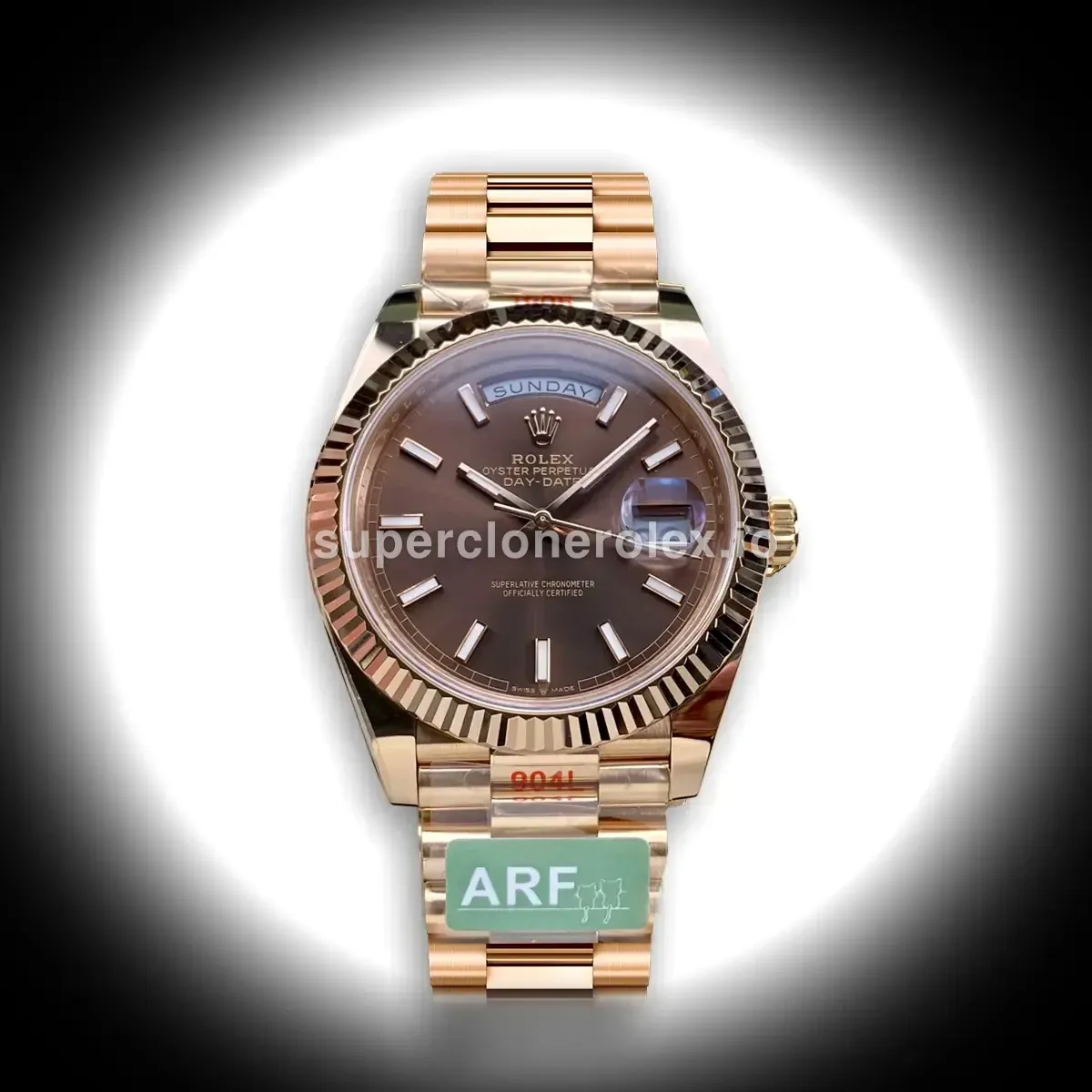 The Rolex Day-Date m228238 with Chocolate Dial features a Chocolate dial on a President bracelet, powered by a precise automatic movement. Crafted in Yellow Gold Plated with Sapphire crystal and 30m (Swiss), this prestigious Day-Date reference delivers the authentic Rolex Presidents watch experience. Available in 36 mm, this elegant ladies timepiece offers premium quality super clone craftsmanship at an accessible price point.