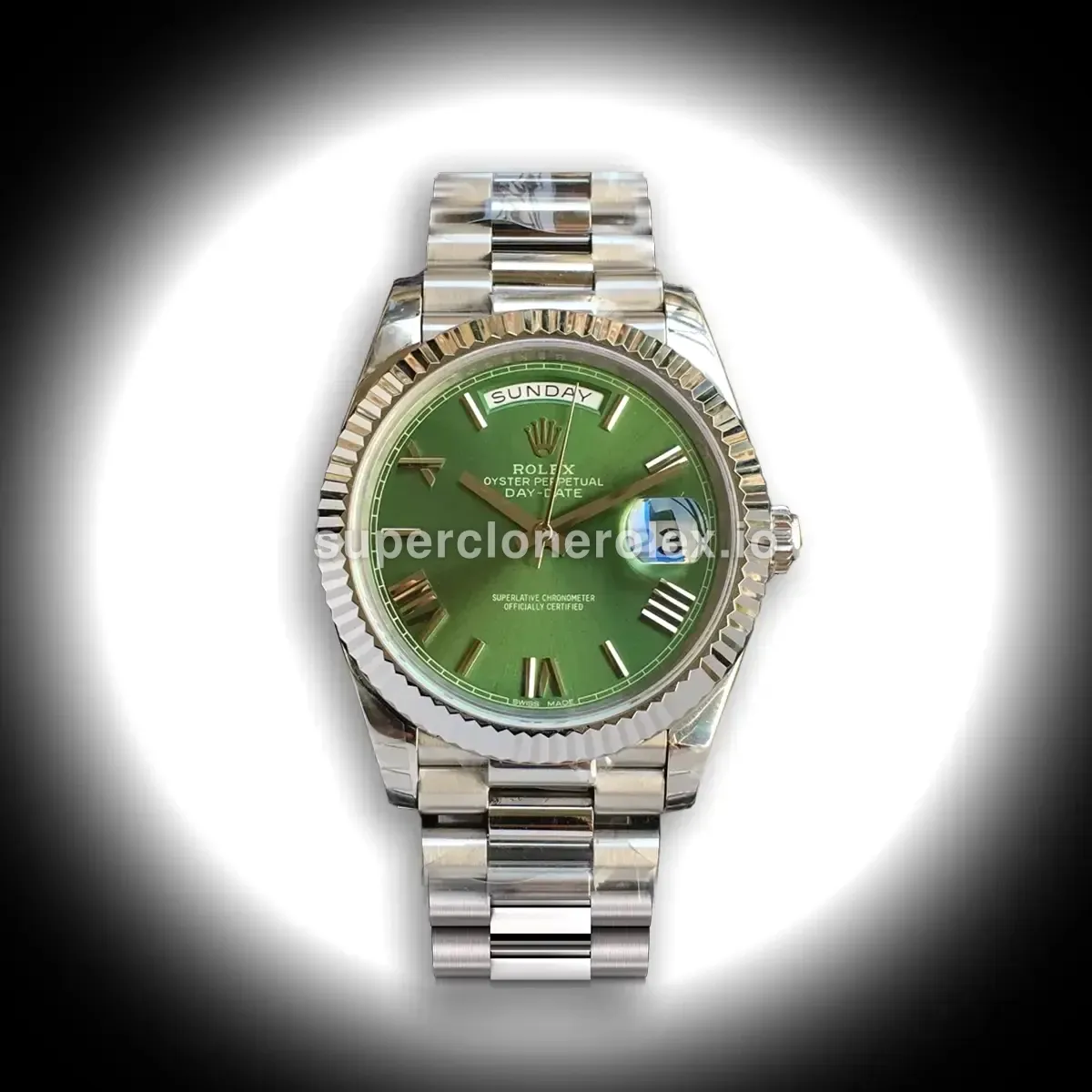 The Rolex Day-Date 228238 Green Dial Watch features a Green dial on a President bracelet, powered by a precise automatic movement. Crafted in White Gold Plated with Sapphire crystal and 30m (Swiss), this prestigious Day-Date reference delivers the authentic Rolex Presidents watch experience. Available in 36 mm, this elegant ladies timepiece offers premium quality super clone craftsmanship at an accessible price point.