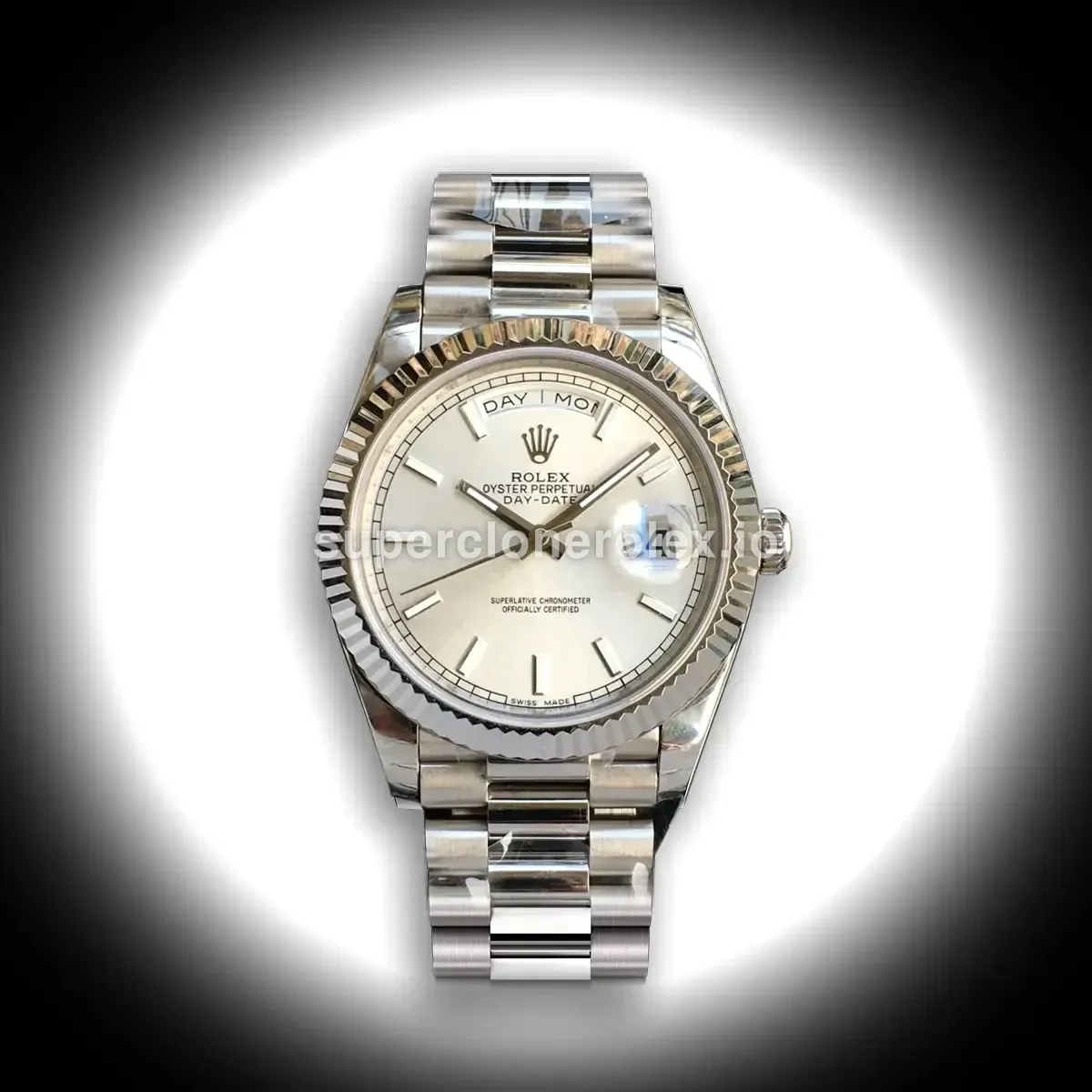 The Rolex Day-Date 228238 Silver Dial Fluted Bezel Watch features a Silver dial on a President bracelet, powered by a precise automatic movement. Crafted in White Gold Plated with Sapphire crystal and 30m (Swiss), this prestigious Day-Date reference delivers the authentic Rolex Presidents watch experience. Available in 36 mm, this elegant ladies timepiece offers premium quality super clone craftsmanship at an accessible price point.