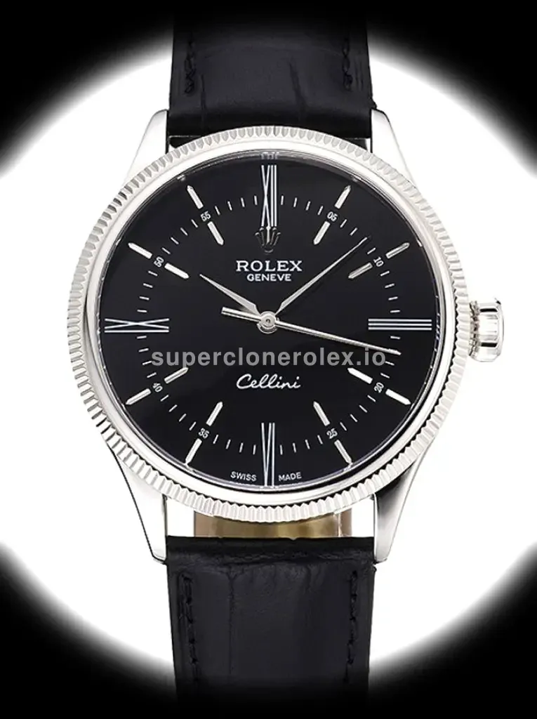 The Rolex Cellini 39mm Black Dial - Premium Collection features a Black dial on a Leather strap bracelet, powered by a precise automatic movement. Crafted in Stainless Steel with Sapphire crystal and 30m (Swiss), this Cellini reference delivers authentic Rolex aesthetics. Available in 39 mm, this precision timepiece offers premium quality super clone craftsmanship at an accessible price point.