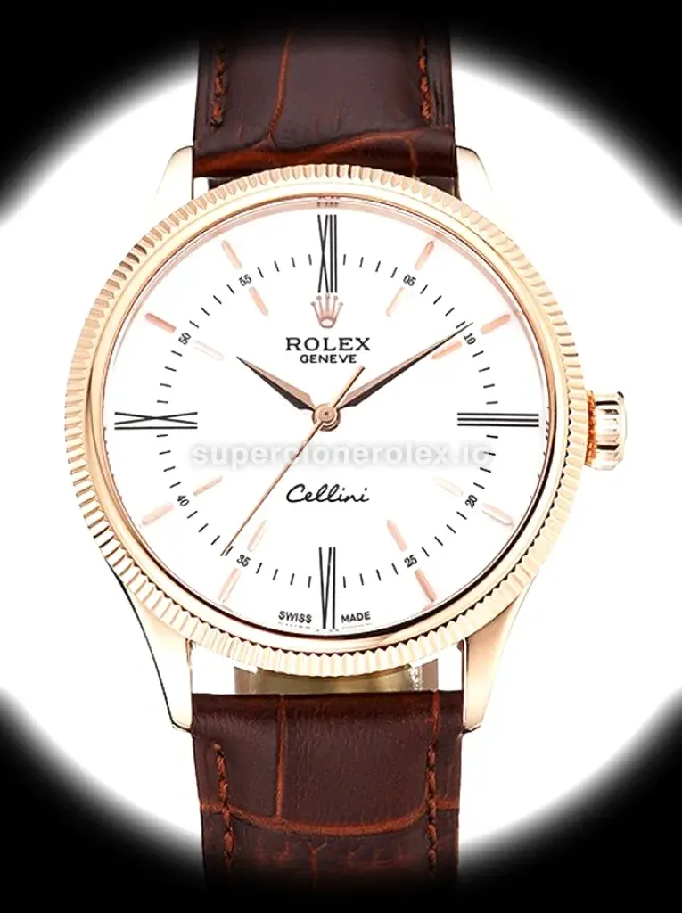 The Rolex Cellini 39mm White Dial - Distinguished Style features a White dial on a Leather strap bracelet, powered by a precise automatic movement. Crafted in Rose Gold Plated with Sapphire crystal and 30m (Swiss), this Cellini reference delivers authentic Rolex aesthetics. Available in 39 mm, this precision timepiece offers premium quality super clone craftsmanship at an accessible price point.