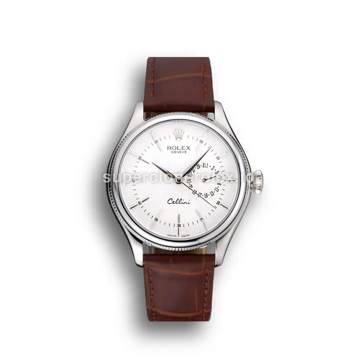 The Rolex Cellini 38mm White Dial – Ref. 622723 features a White dial on a Leather strap bracelet, powered by a precise automatic movement. Crafted in Stainless Steel with Sapphire crystal and 30m (Swiss), this Cellini reference delivers authentic Rolex aesthetics. Available in 38 mm, this precision timepiece offers premium quality super clone craftsmanship at an accessible price point.