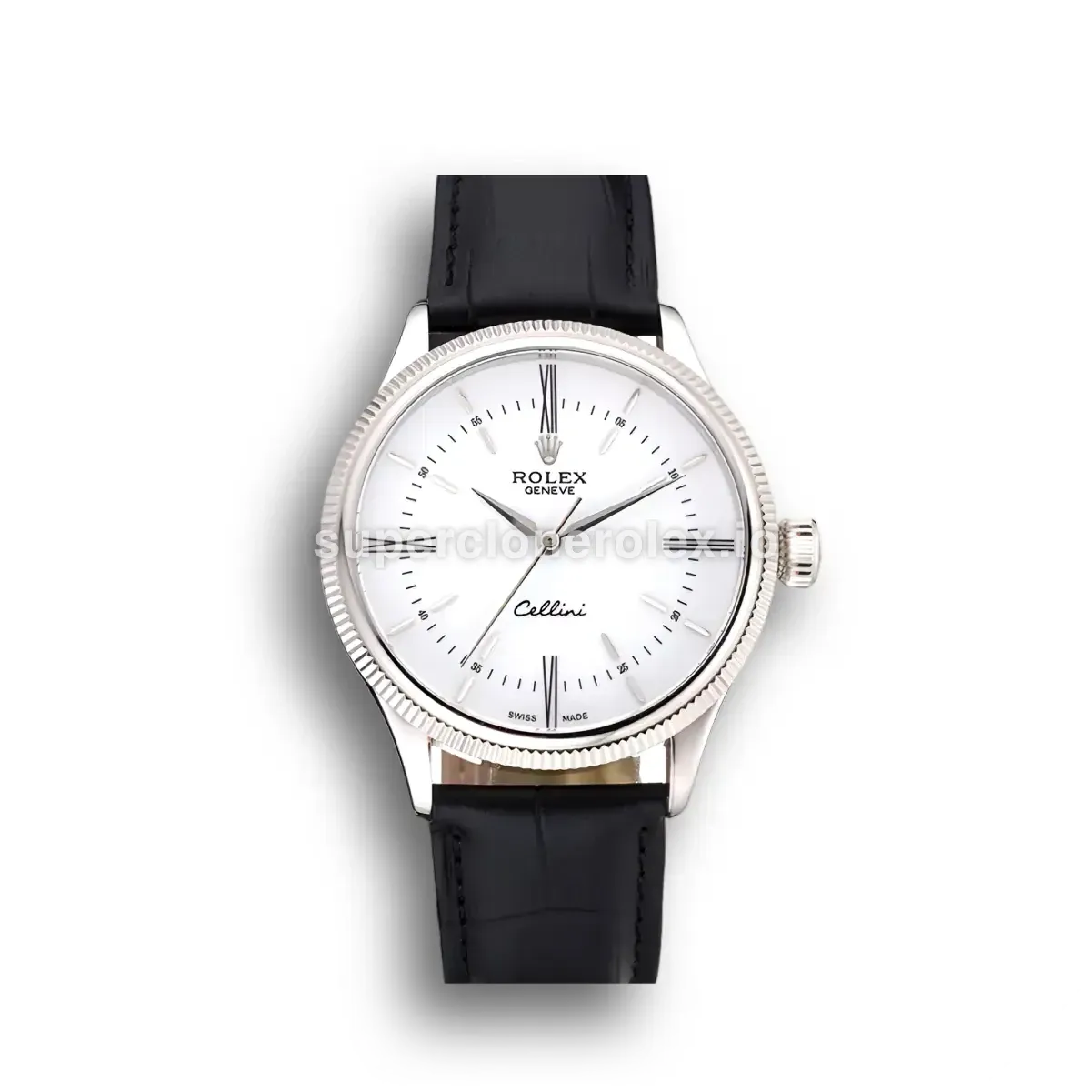 The Rolex Cellini 40mm White Dial – Ref. 622839 features a White dial on a Leather strap bracelet, powered by a precise automatic movement. Crafted in Stainless Steel with Sapphire crystal and 30m (Swiss), this Cellini reference delivers authentic Rolex aesthetics. Available in 40 mm, this precision timepiece offers premium quality super clone craftsmanship at an accessible price point.