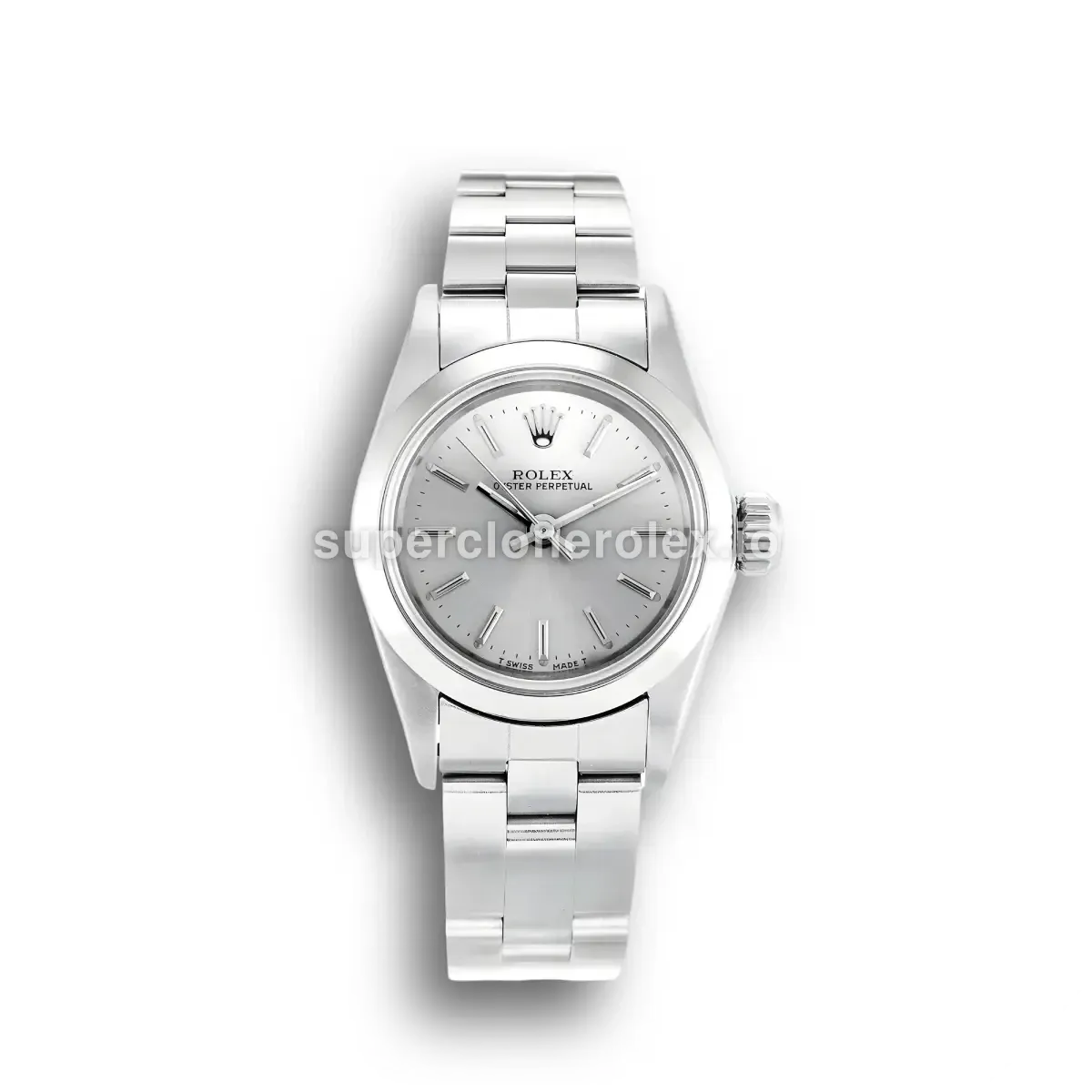The Rolex Oyster Perpetual Lady 26mm Silver Dial 67180 features a Silver dial on a Oyster bracelet, powered by a precise automatic movement. Crafted in Stainless Steel with Sapphire crystal and 30m (Swiss), this Oyster Perpetual reference delivers authentic Rolex aesthetics. Available in 26 mm, this elegant ladies timepiece offers premium quality super clone craftsmanship at an accessible price point.
