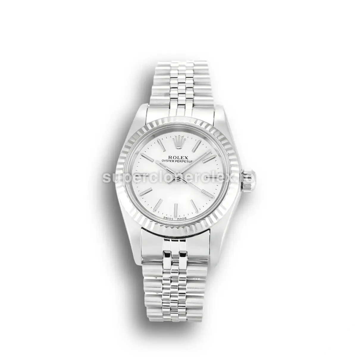 The Rolex Oyster Perpetual Lady 24mm Silver Dial 67194 features a Silver dial on a Jubilee bracelet, powered by a precise automatic movement. Crafted in Stainless Steel with Sapphire crystal and 30m (Swiss), this Oyster Perpetual reference delivers authentic Rolex aesthetics. Available in 24 mm, this elegant ladies timepiece offers premium quality super clone craftsmanship at an accessible price point.