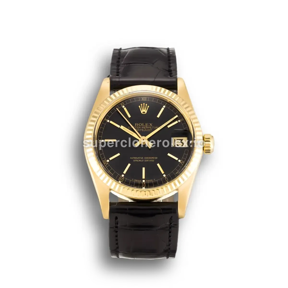 The Rolex Datejust 6827 Mid-Size 31mm Black Dial features a Black dial on a Leather strap bracelet, powered by a precise automatic movement. Crafted in Yellow Gold Plated with Sapphire crystal and 30m (Swiss), this Datejust reference delivers authentic Rolex aesthetics. Available in 31 mm, this elegant ladies timepiece offers premium quality super clone craftsmanship at an accessible price point.