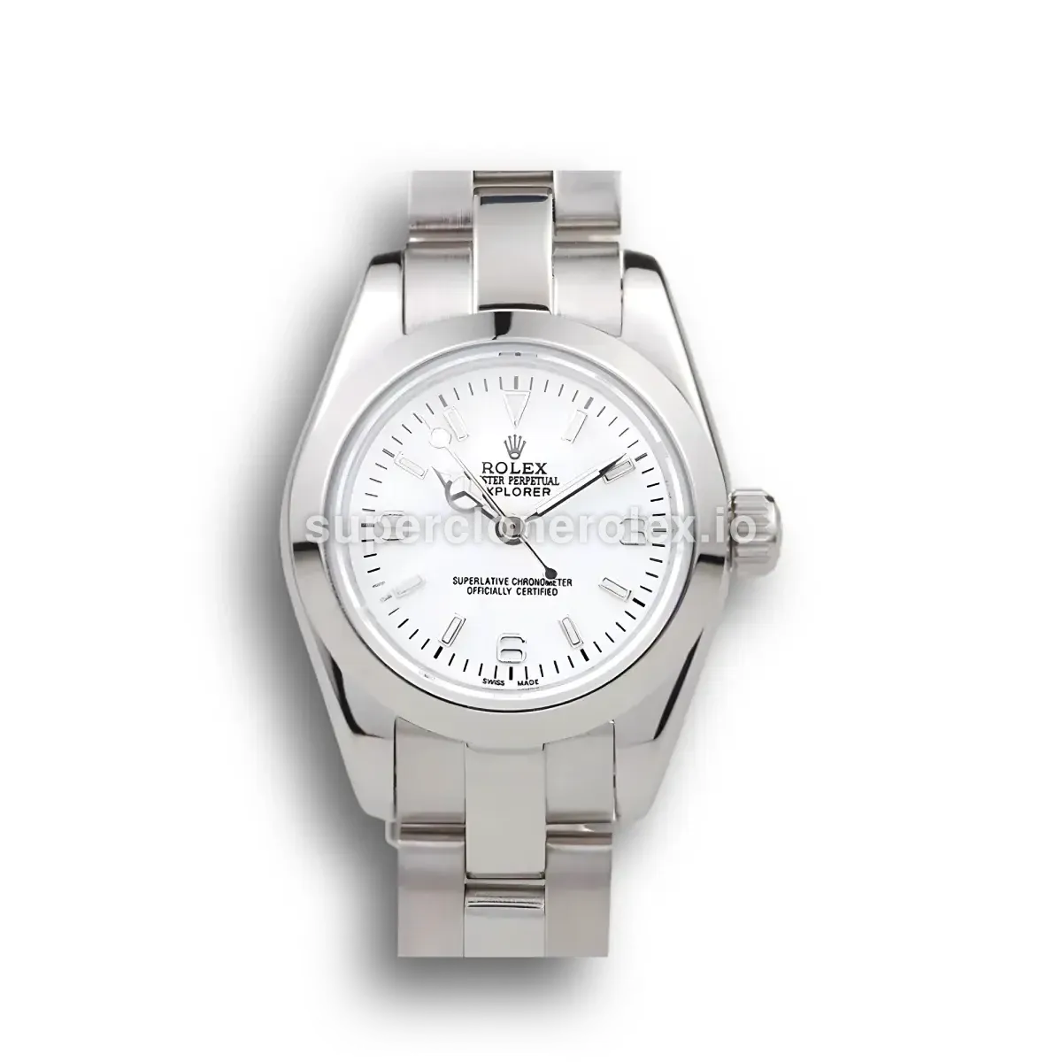 The Rolex Explorer 26mm White Dial 98088 features a White dial on a Oyster bracelet, powered by a precise automatic movement. Crafted in Stainless Steel with Sapphire crystal and 30m (Swiss), this Explorer reference delivers authentic Rolex aesthetics. Available in 26 mm, this elegant ladies timepiece offers premium quality super clone craftsmanship at an accessible price point.