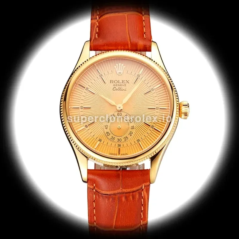 The Rolex Cellini 38mm Gold Dial - Premium Edition features a Gold dial on a Leather strap bracelet, powered by a precise automatic movement. Crafted in Yellow Gold Plated with Sapphire crystal and 30m (Swiss), this Cellini reference delivers authentic Rolex aesthetics. Available in 38 mm, this precision timepiece offers premium quality super clone craftsmanship at an accessible price point.