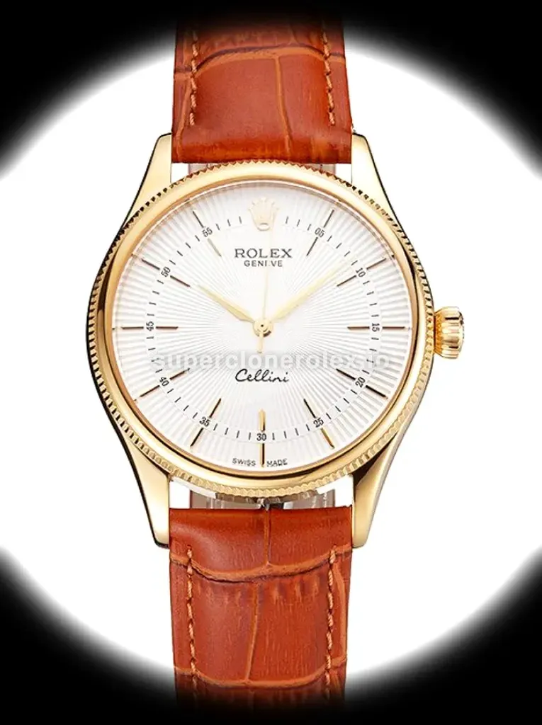 The Rolex Cellini 38mm White Dial - Refined Style features a White dial on a Leather strap bracelet, powered by a precise automatic movement. Crafted in Yellow Gold Plated with Sapphire crystal and 30m (Swiss), this Cellini reference delivers authentic Rolex aesthetics. Available in 38 mm, this precision timepiece offers premium quality super clone craftsmanship at an accessible price point.