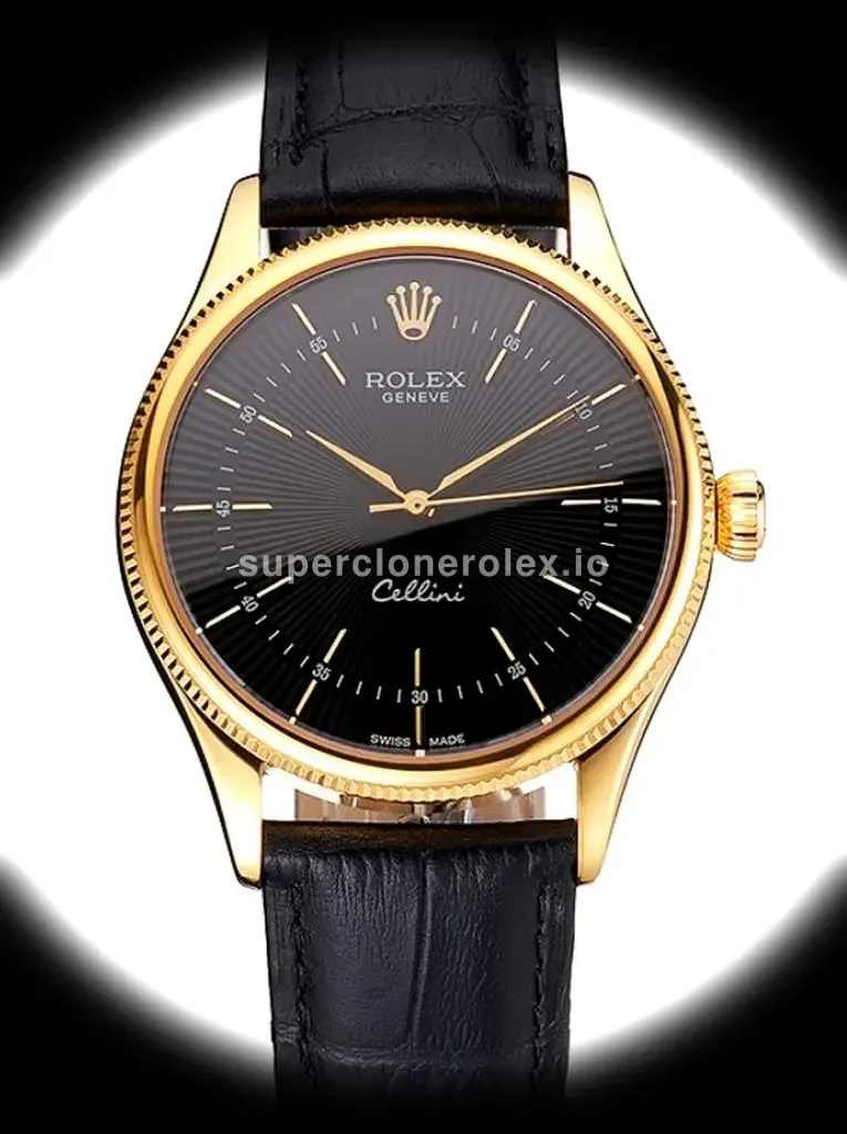The Rolex Cellini 38mm Black Dial - Classic Dress Watch features a Black dial on a Leather strap bracelet, powered by a precise automatic movement. Crafted in Yellow Gold Plated with Sapphire crystal and 30m (Swiss), this Cellini reference delivers authentic Rolex aesthetics. Available in 38 mm, this precision timepiece offers premium quality super clone craftsmanship at an accessible price point.