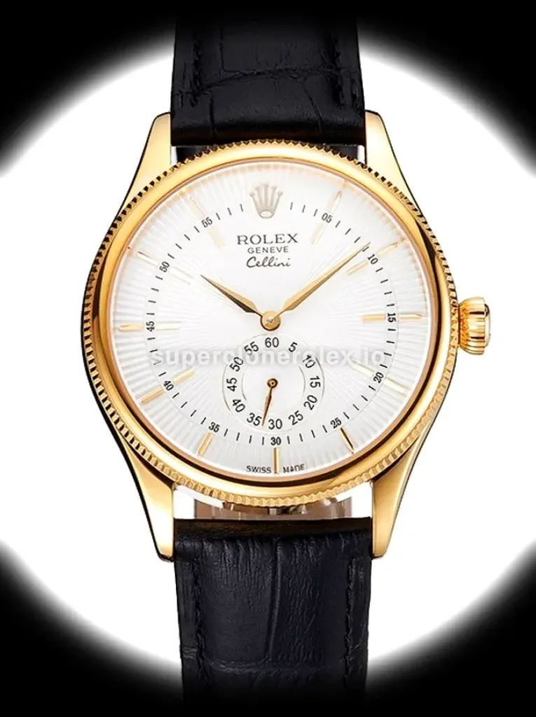 The Rolex Cellini 38mm White Dial - Elegant Timepiece features a White dial on a Leather strap bracelet, powered by a precise automatic movement. Crafted in Yellow Gold Plated with Sapphire crystal and 30m (Swiss), this Cellini reference delivers authentic Rolex aesthetics. Available in 38 mm, this precision timepiece offers premium quality super clone craftsmanship at an accessible price point.