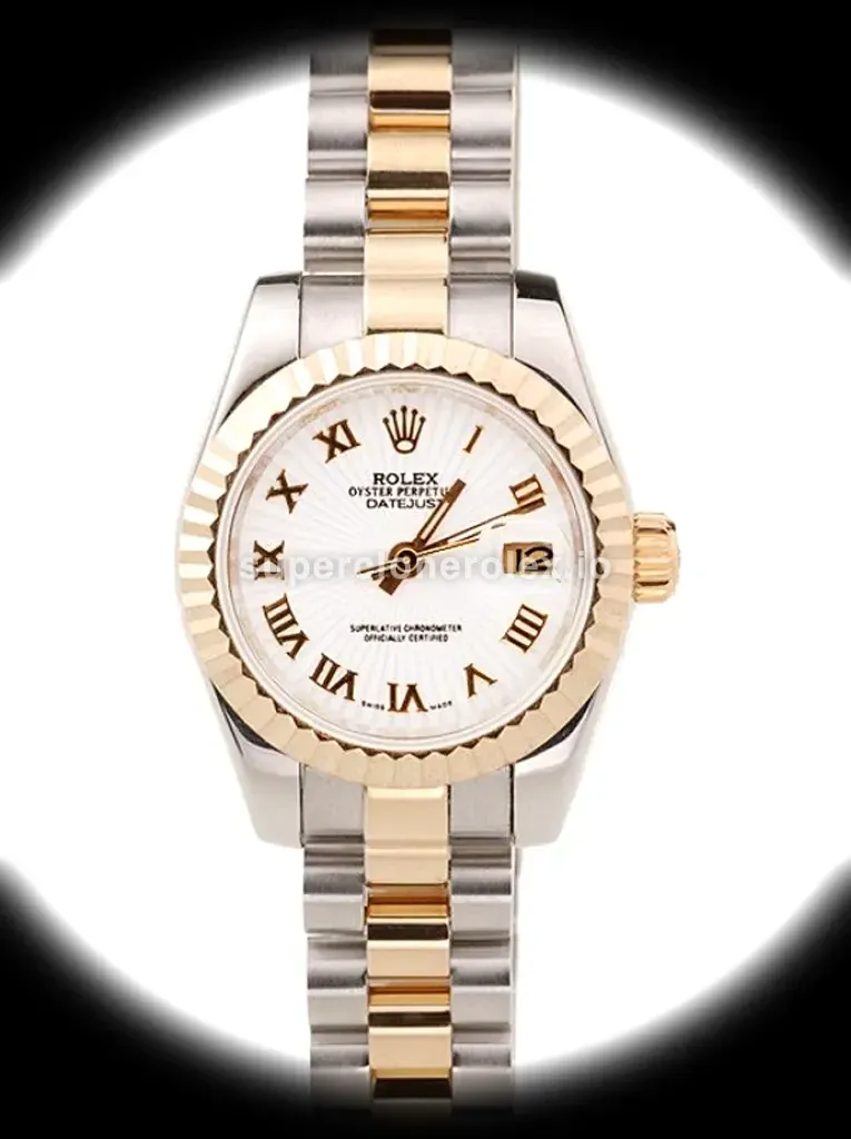 The Rolex Lady-Datejust 26mm – Classic White Dial features a White dial on a Oyster bracelet, powered by a precise automatic movement. Crafted in Stainless Steel & Yellow Gold Plated with Sapphire crystal and 30m (Swiss), this Datejust reference delivers authentic Rolex aesthetics. Available in 26 mm, this elegant ladies timepiece offers premium quality super clone craftsmanship at an accessible price point.